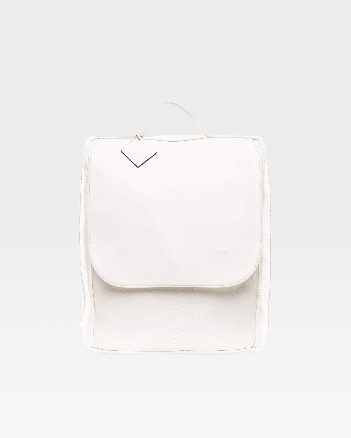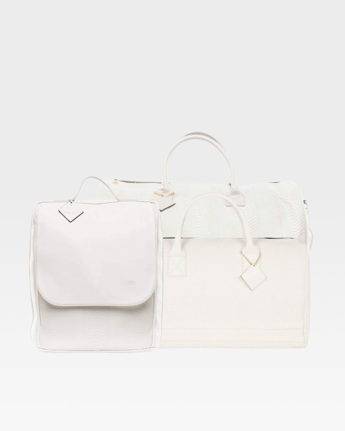 Travel in pristine style with the Tote&Carry Apollo 1 Travel Set in classic White. This perfectly coordinated duo, featuring a sleek backpack and matching duffle bag, is designed for the modern traveler who values both fashion and function. Both pieces are crafted from premium white faux leather with a subtle, sophisticated snakeskin texture, accented by elegant gold-tone hardware. This set offers versatile carrying options and ample space, ensuring you journey with coordinated polish and effortless luxury.