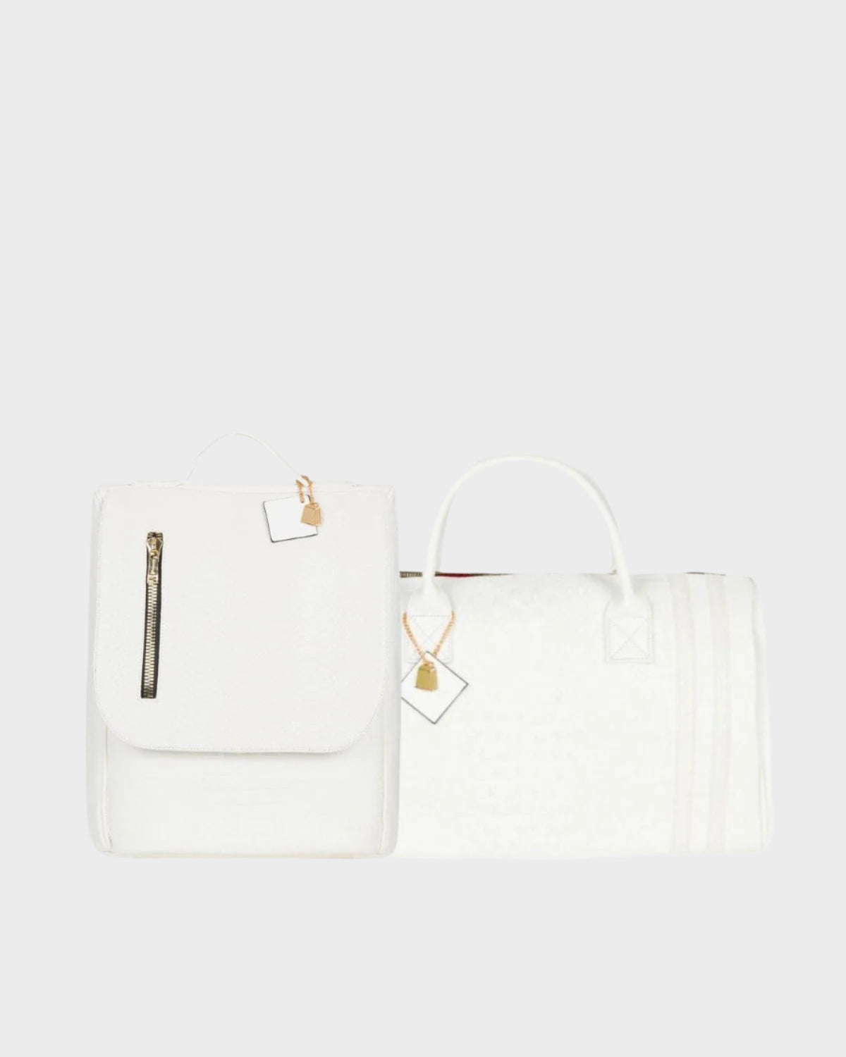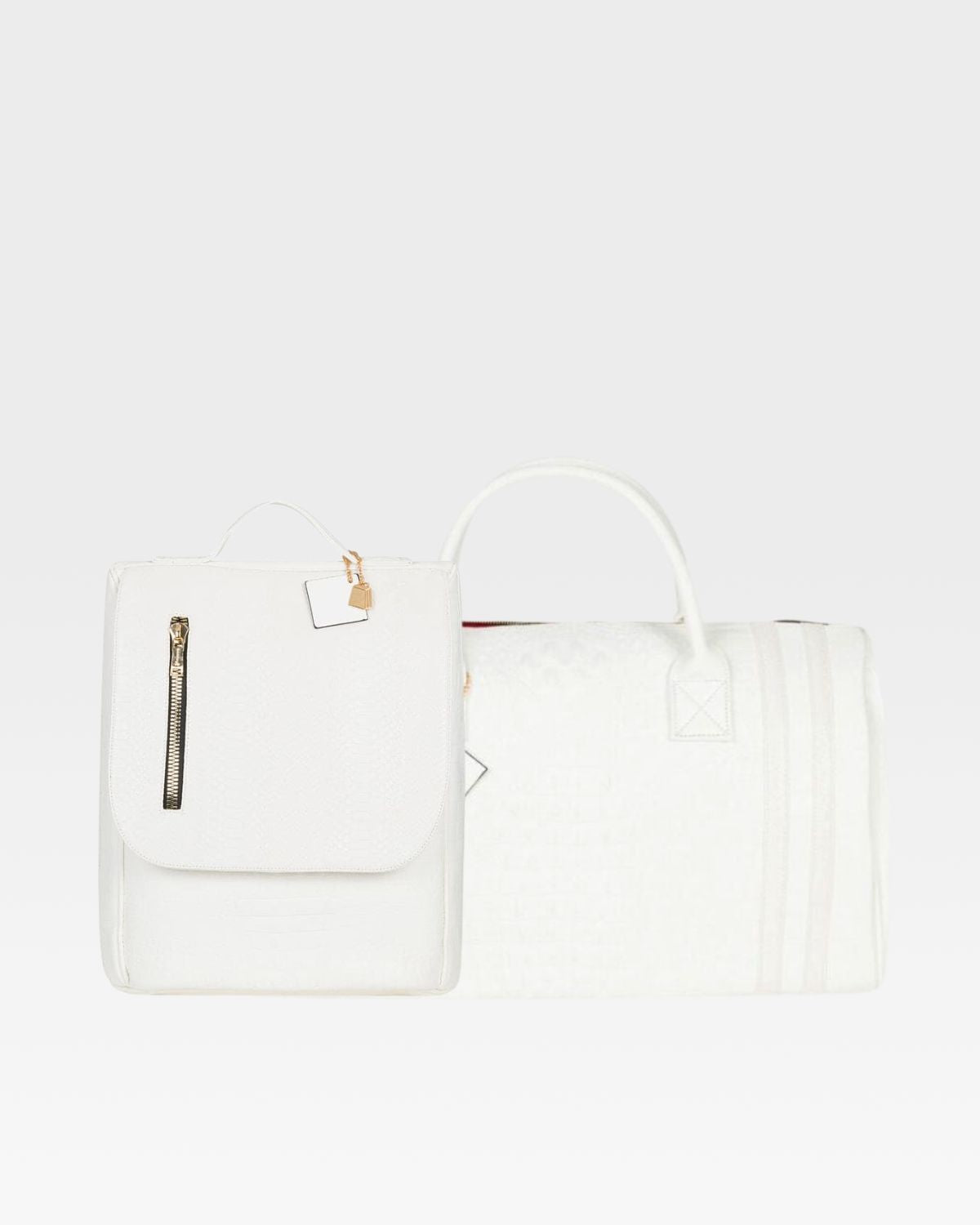 Journey with impeccable taste using the Tote&Carry Apollo 2 Travel Set in pristine White. This perfectly matched backpack and duffle bag duo is crafted for the modern traveler who prioritizes sophisticated style and seamless function. Both pieces feature a luxurious white faux crocodile-embossed texture, elegantly accented by gleaming gold-tone hardware for a touch of opulence. With versatile carrying options and generous storage, this set ensures you travel with coordinated elegance and practical ease.