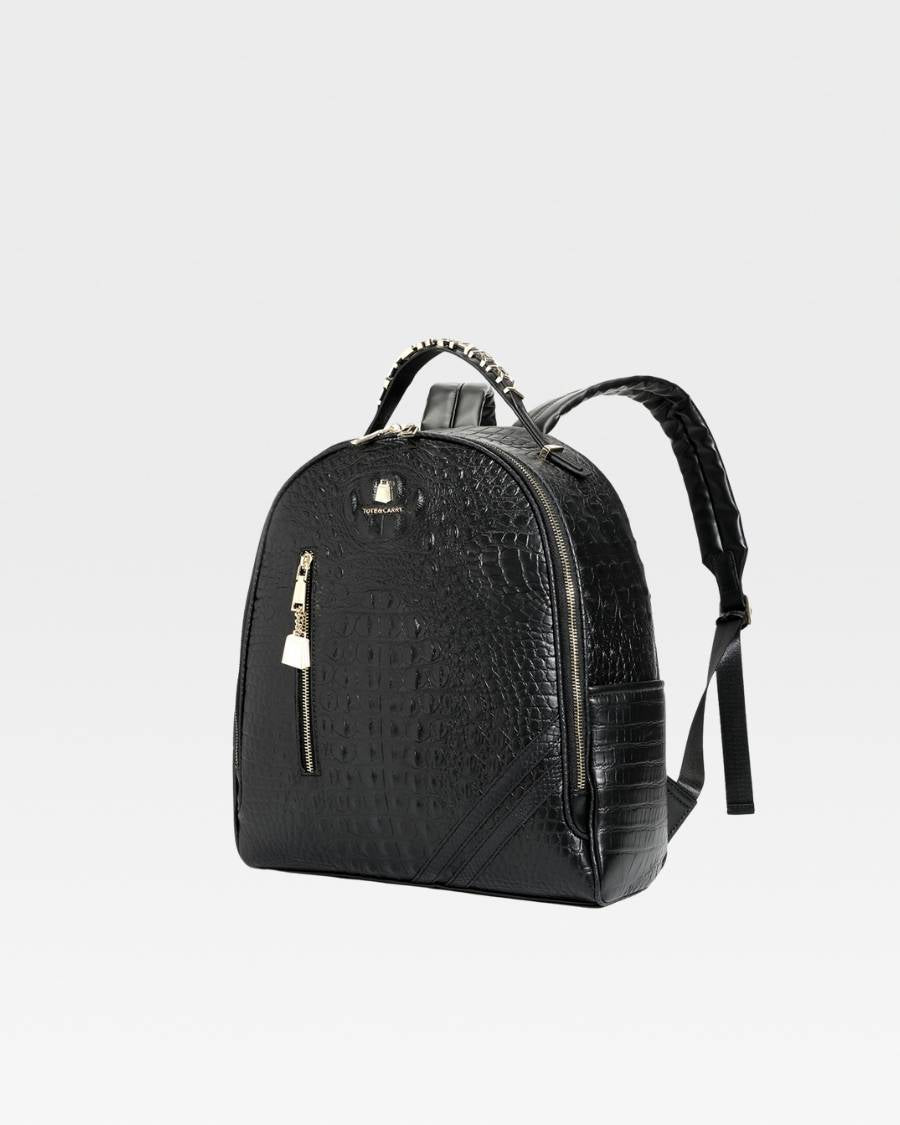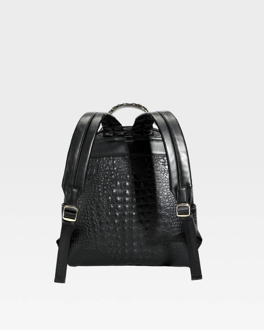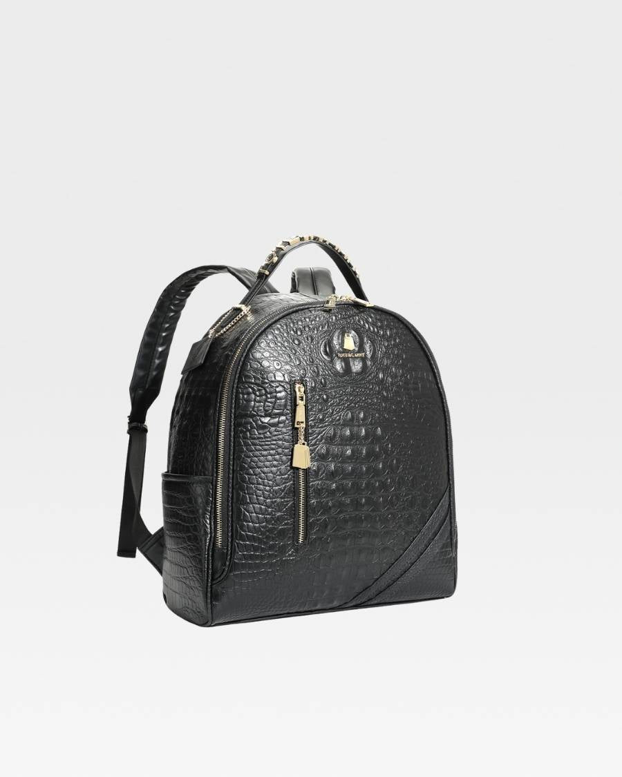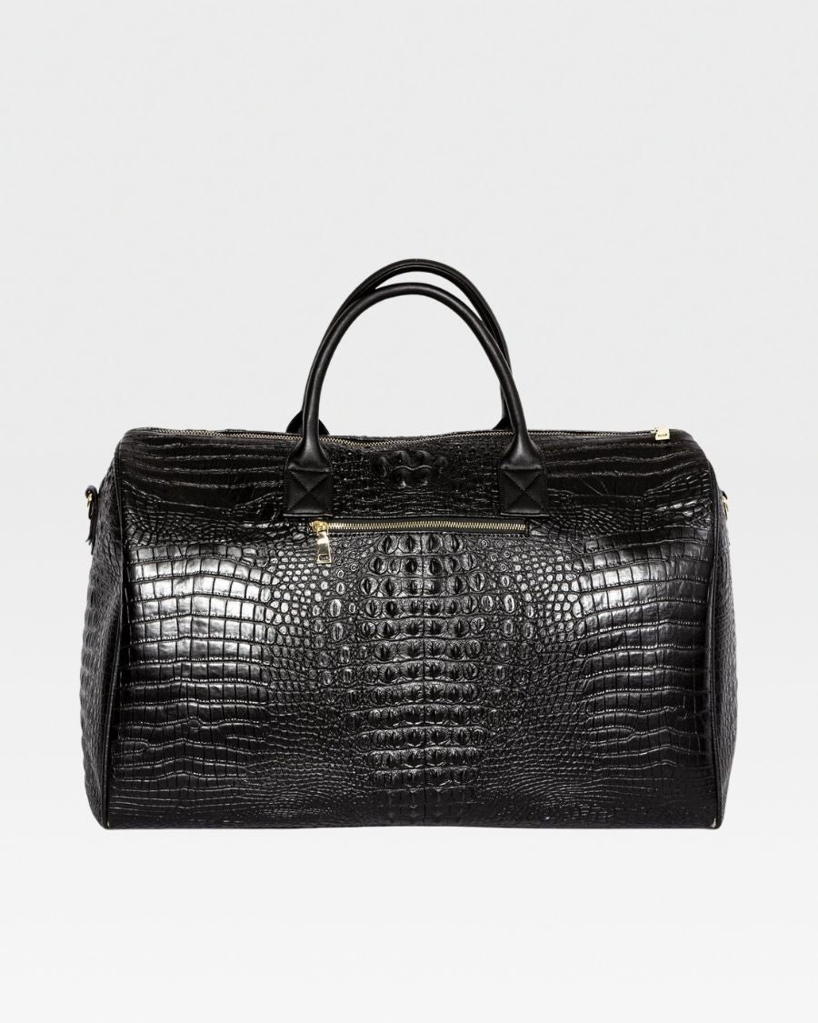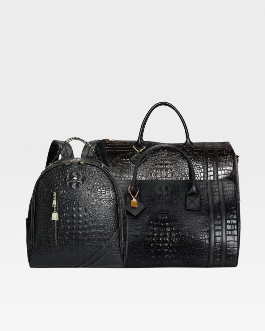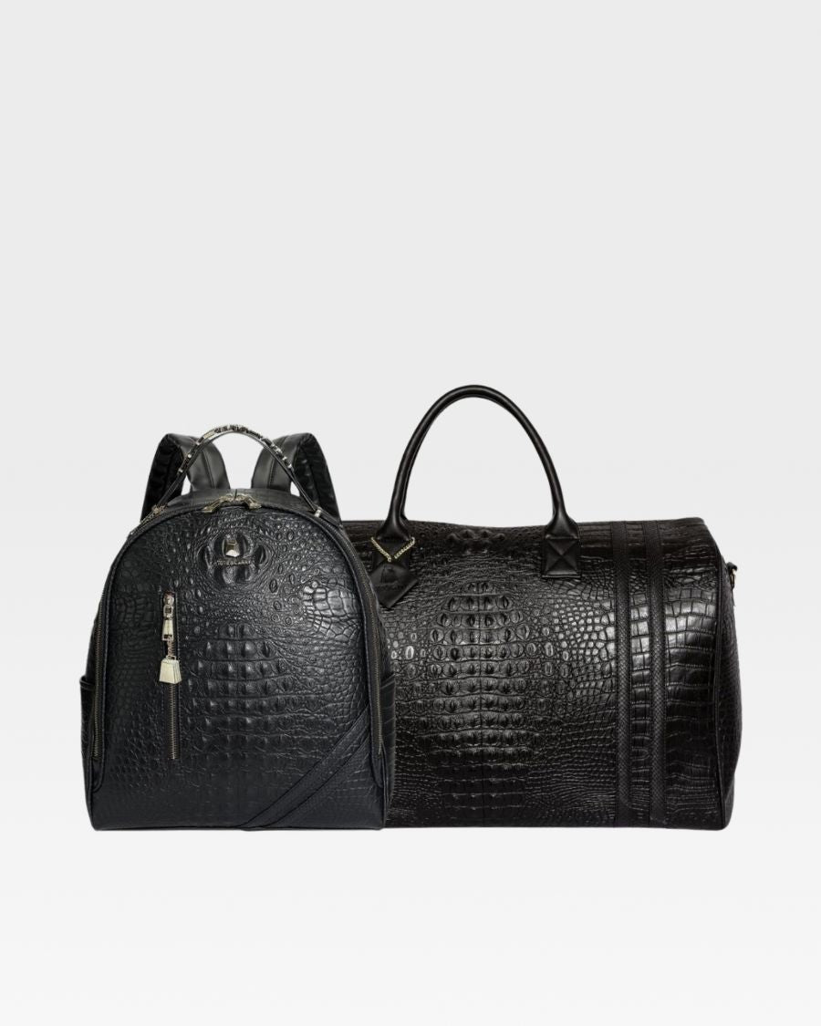 Enjoy your travels with the Black Apollo 2 BFF Faux Snakeskin Travel Set. This chic set includes a BFF backpack and a spacious duffle bag, perfect for all your travel needs. Made with eco-friendly materials, both pieces provide multiple pockets for convenient storage. Gold zipper accents and thoughtful design details make this set your perfect travel companion.