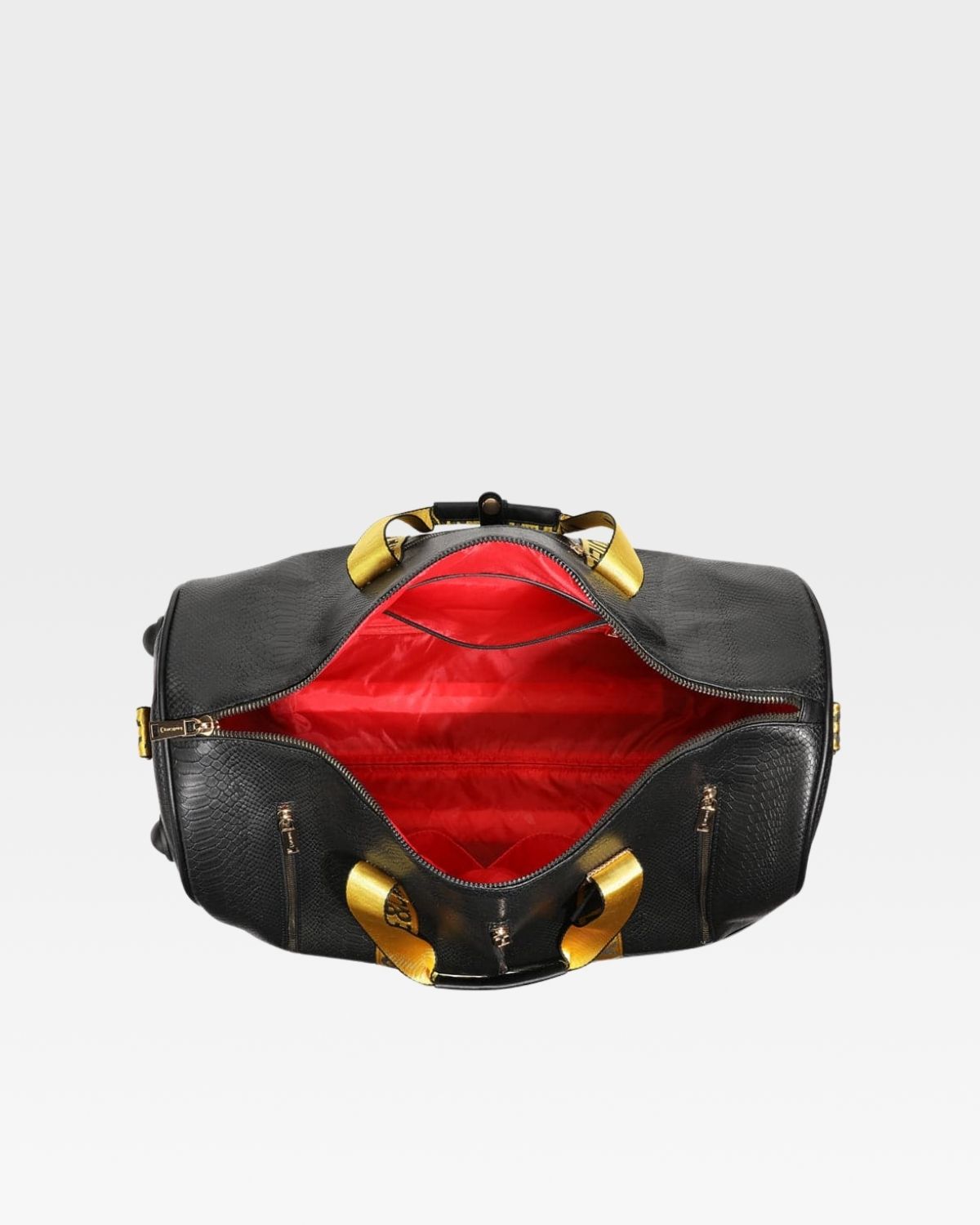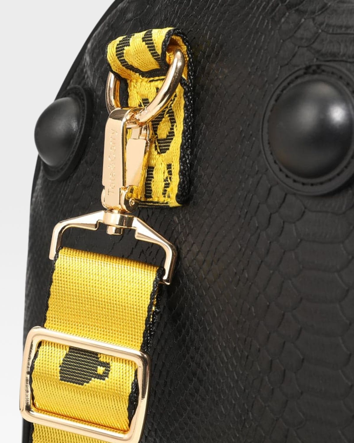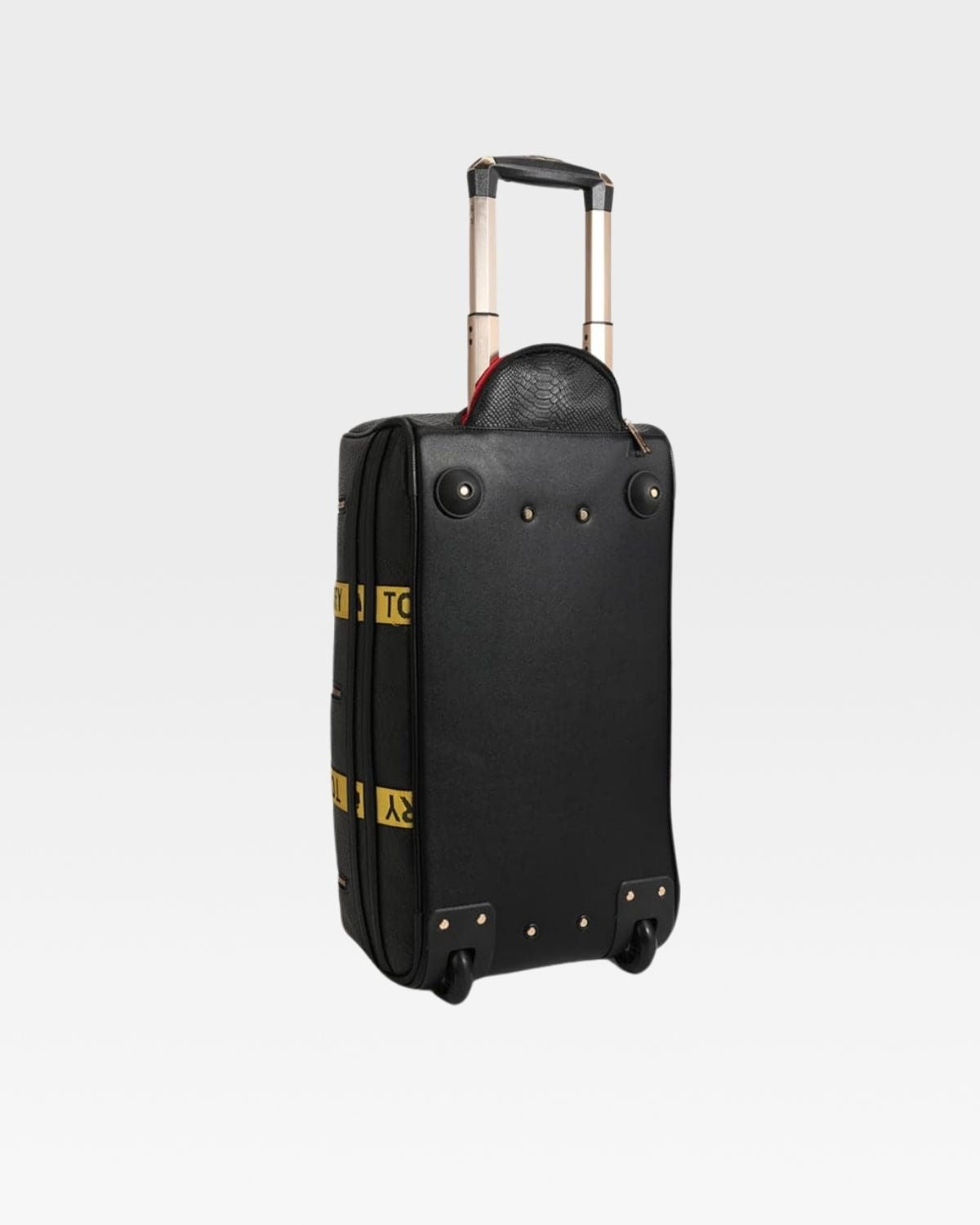 Command attention at baggage claim with the Tote&Carry Caution Tape Rolling Duffle Bag in Black & Yellow. This ultra-bold travel bag combines effortless rolling convenience with high-impact street style that can't be missed. Its black textured body features striking yellow webbing straps printed with the Tote&Carry logo, vividly mimicking high-visibility caution tape. Multiple gold-tone zippers add functional shine and secure storage. Travel loud, travel easy, travel unmistakable.