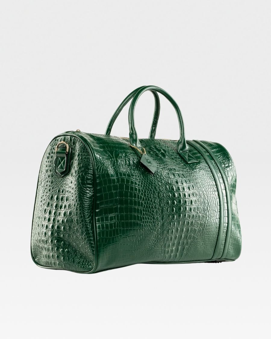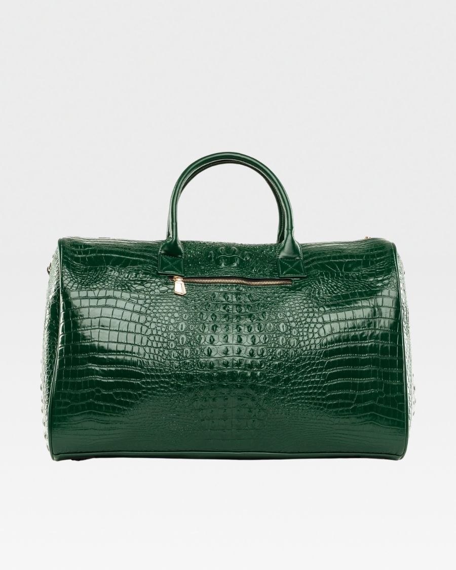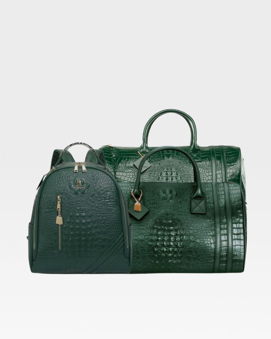 Enjoy your travels with the Emerald Green Apollo 2 BFF Faux Snakeskin Travel Set. This chic set includes a BFF backpack and a spacious duffle bag, perfect for all your travel needs. Made with eco-friendly materials, both pieces provide multiple pockets for convenient storage. Gold zipper accents and thoughtful design details make this set your perfect travel companion.