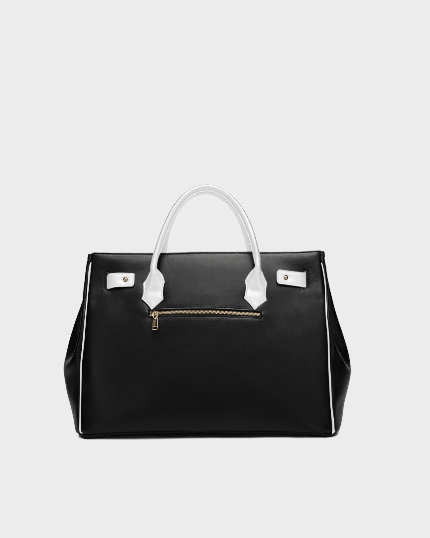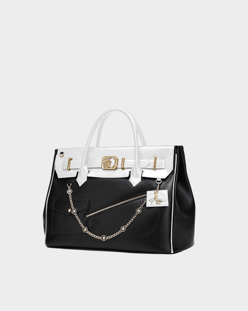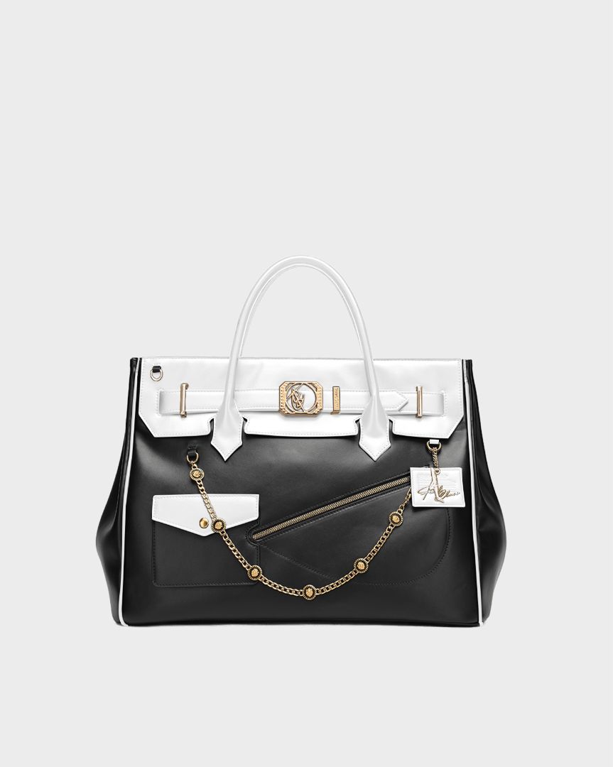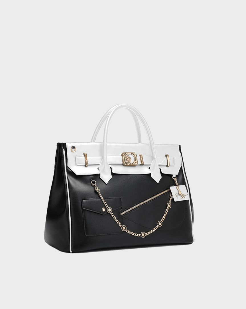 Command attention with the Tote&Carry Monarch Grandeur Bag in a striking Black & White design. This exquisitely crafted statement piece is for those who appreciate bold sophistication, featuring a structured silhouette in premium faux leather with sharp color blocking. The crisp white top flap, handles, and accents dramatically contrast with the deep black body. Lavish gold-tone hardware, including a signature central emblem and multiple decorative chain details, elevates its regal appeal. With a spacious interior, exterior pockets, and comfortable top handles, this bag is a masterpiece of high-fashion functionality.